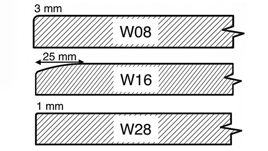 The W16 profile is essentially a flat front design but with beveled sides. The outer 25 mm is smoothened off by up to 4 mm of the thickness.